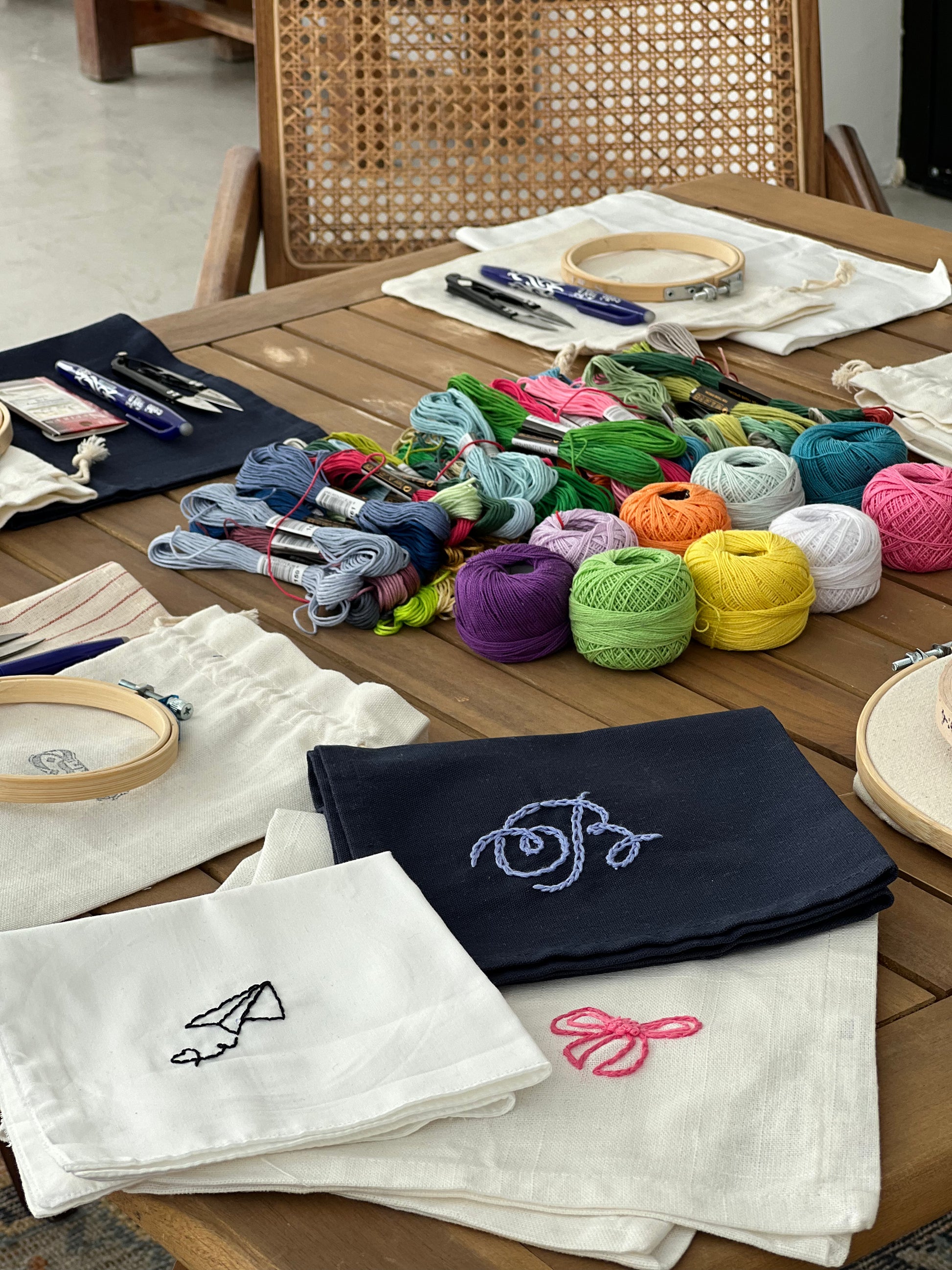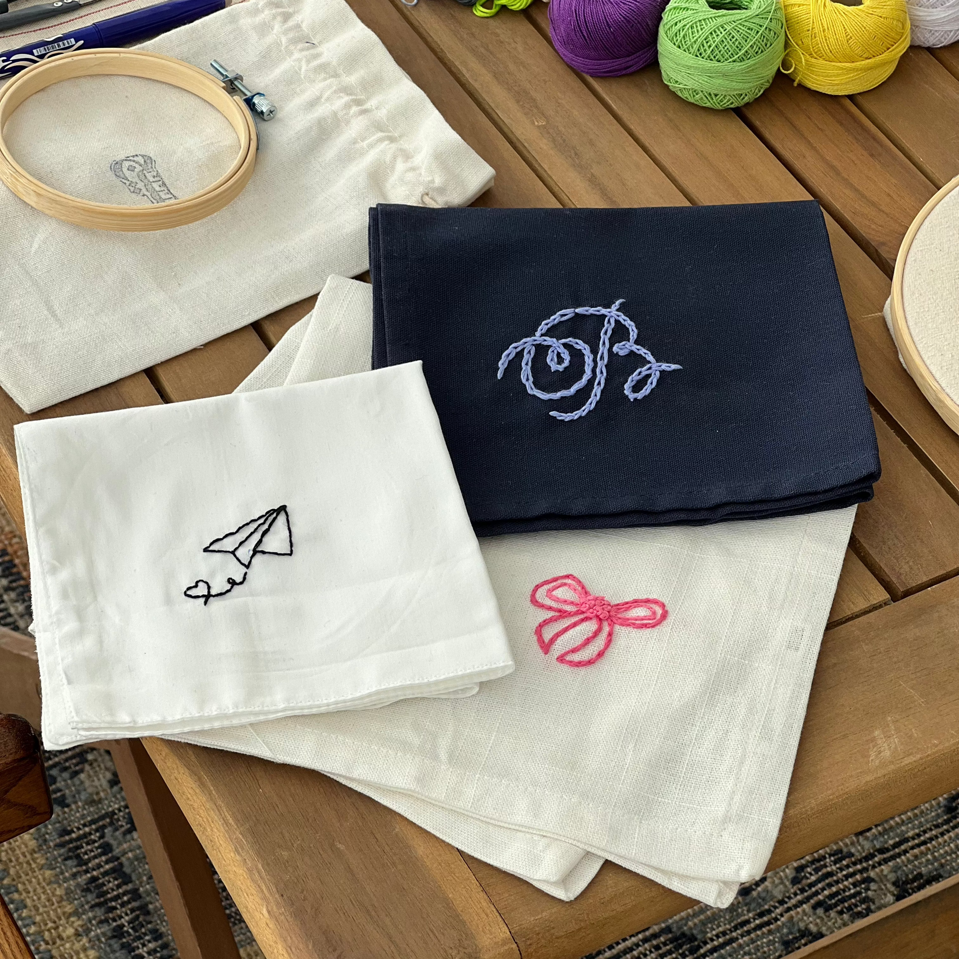 خلال الورشة، نتعلم الأساسيات خطوة بخطوة، ونطبّقها على مناديل قماشية راقية من اختيارك