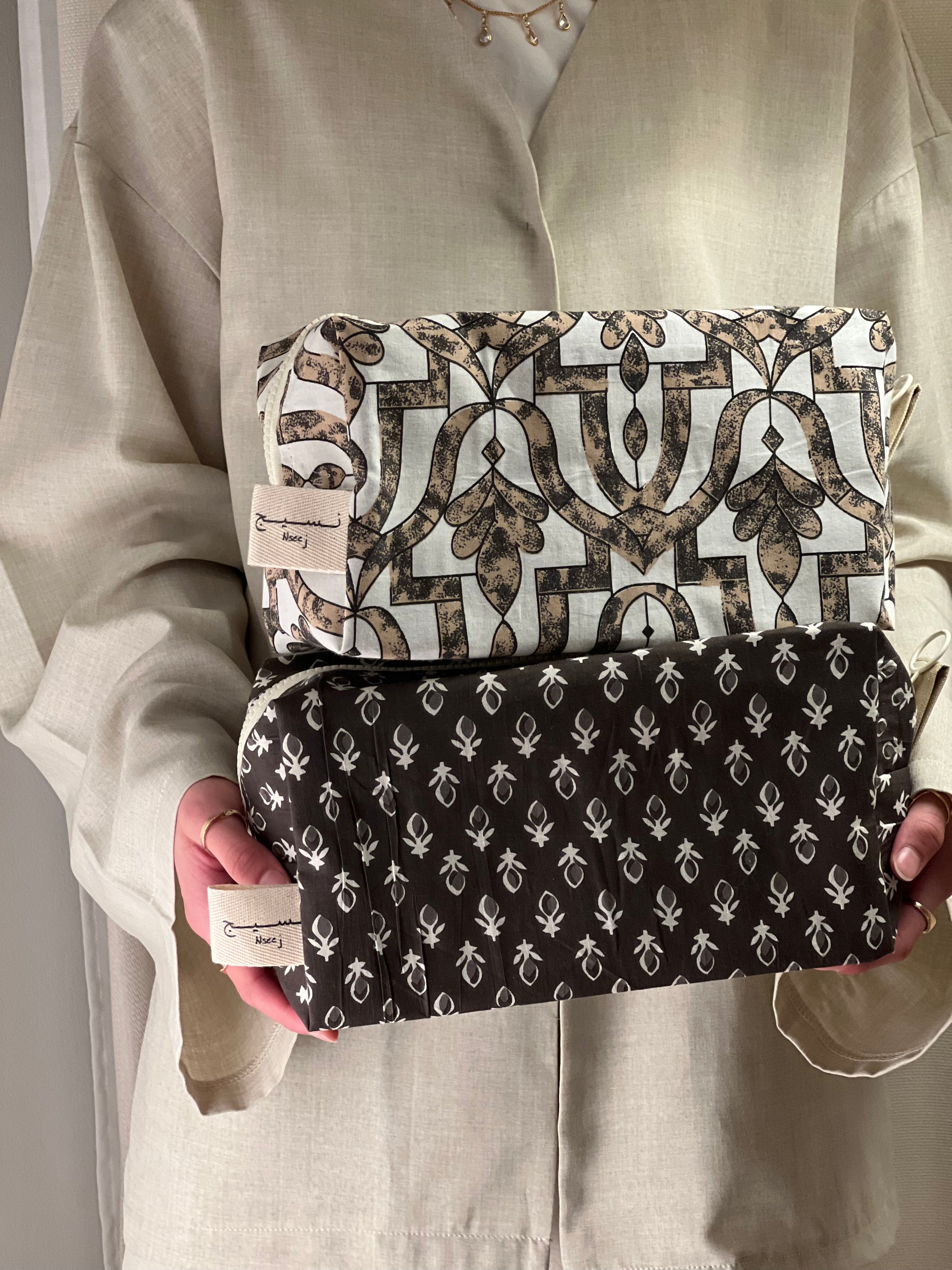 حقيبة مصنوعة من قماش هندية مختارة بعناية، ومبطنة بخامة داخلية صلبة، سهلة التنظيف ومناسبة للغسيل اليدوي والآلي سحابها ناعم وثابت ما يخونك وتفصيلها دقيق من كل زاوية نهتم بأدق التفاصيل عشان تلمسين الفرق من أول لمسه .